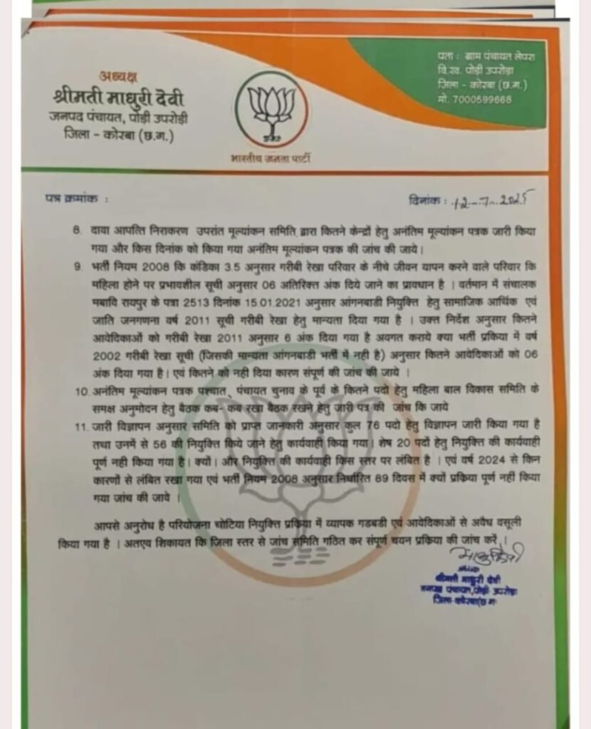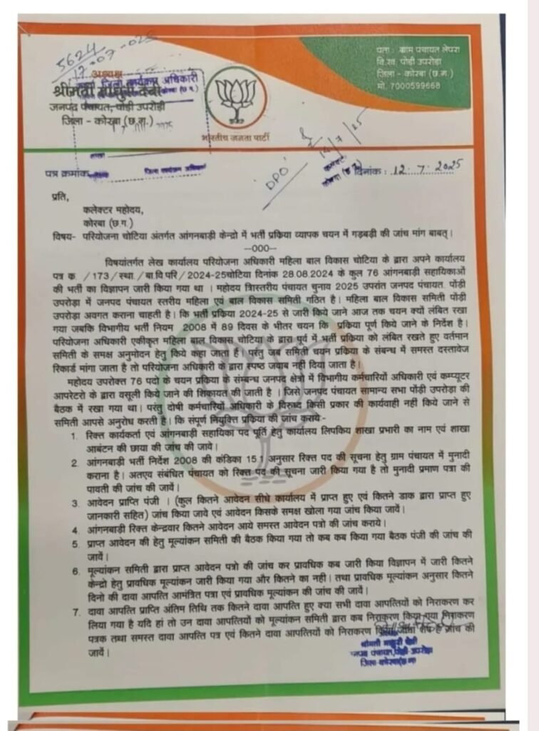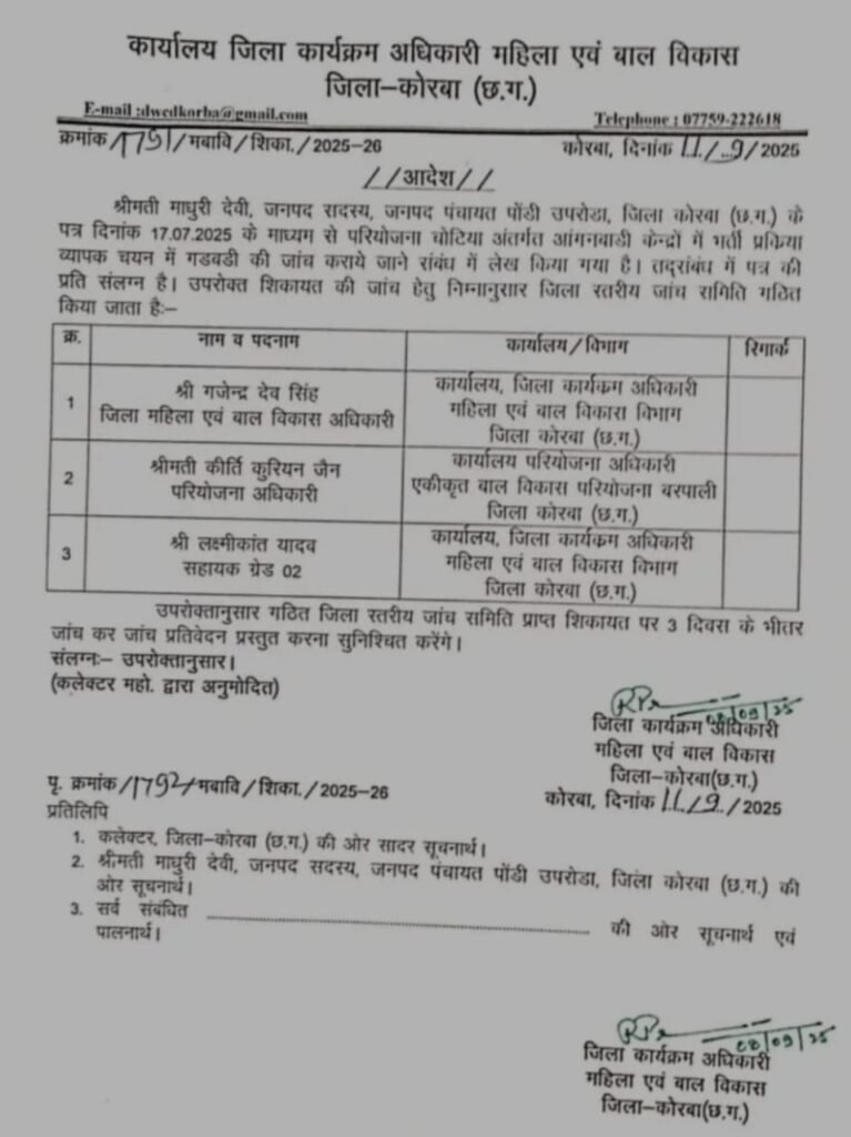 चोटिया परियोजना में 2 वर्ष पूर्व हुई आंगनबाडी कार्यकर्ता सहायिका के रिक्त 76 पदों पर हुई भर्ती प्रक्रिया में महिला एवं बाल विकास समिति की अध्यक्ष श्रीमती पूजा दुबे द्वारा लगाए गए अनियमितता के आरोप एवं तत्कालीन कलेक्टर अजीत वसंत के निर्देश पर तत्कालीन डीपीओ रेणु प्रकाश के द्वारा 11 सितम्बर 2025 को 3 सदस्यीय जांच कमेटी गठित कर दिए गए जांच आदेश के उपरांत पारदर्शिता पूर्ण जांच के लिए तत्कालीन परियोजना अधिकारी मनोज अग्रवाल को चोटिया के अतिरिक्त प्रभार से मुक्त कर दिया गया।