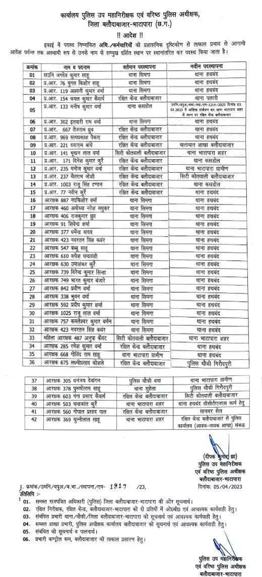 05.04.23| बलौदाबाजार-भाटापारा जिले में कानून-व्यवस्था में कसावट की लिहाज से पुलिस उप महानिरीक्षक एवं वरिष्ठ पुलिस अधीक्षक कार्यालय की ओर से पदस्थ एक सहायक उपनिरीक्षक के साथ 14 प्रधान आरक्षकों और 27 आरक्षकों का तबादला किया गया है.