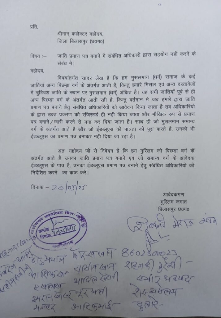 बिलासपुर, लगातार बिलासपुर ज़िले के विभिन्न तहसीलों से ये शिकायतें आ रही है की EWS (Economically Weaker Section) के पात्र लोगों का प्रमाण पत्र विभिन्न तहसीलों में नहीं बनाया जाना साथ ही नियमों का हवाला देकर पिछड़ा वर्ग का प्रमाण पत्र भी मुस्लिम समाज का नहीं बनाया जा रहा है इससे व्यथित हो बिलासपुर मुस्लिम समाज का एक प्रतिनिधिमंडल जिलाधीश से मिलकर ज्ञापन सौंप वस्तु स्थिति से अवगत करा इसे त्वरित सुधारने बात रखी गयी।मा.जिलाधीश महोदय ने मुस्लिम समाज के प्रतिनिधिमंडल को आश्वस्त किया की इस ओर जल्द ही नियमतः कार्यवाही हेतु निर्देशित किया जाएगा।