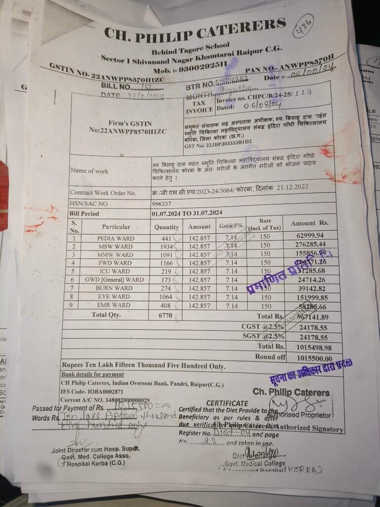 कोरबा मेडिकल कॉलेज अस्पताल में भोजन ठेका खत्म होने के बावजूद अवैध रूप से एक्सटेंशन। GST महीनों से जमा नहीं, घटिया भोजन परोसा जा रहा, बिलिंग में हेराफेरी — पढ़िए घोटाले की पूरी रिपोर्ट…