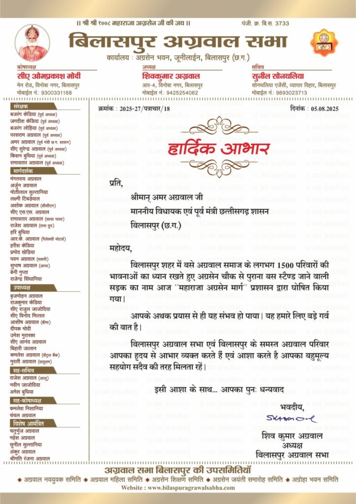 बिलासपुर(ग्रामयात्रा छत्तीसगढ़ )। शहरवासियों के लिए एक गौरवपूर्ण क्षण में, बिलासपुर के ऐतिहासिक बस स्टैंड टेलीफोन एक्सचेंज मार्ग को अब “महाराजा अग्रसेन मार्ग” के नाम से जाना जाएगा। इस महत्वपूर्ण नामकरण निर्णय के पीछे अग्रवाल समाज की एकजुट पहल और सामाजिक योगदान की भावना रही है।