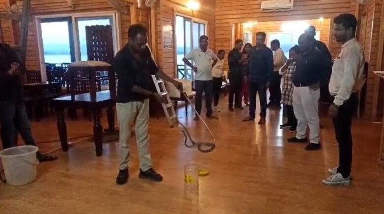 जिसके कारण पर्यटन डरे हुए हैं जिस पर जितेंद्र सारथी ने थोड़ी देर में टीम को भेजने की बात कही तब तक नजर रखने को कहा साथ ही दूरी बनाए रखने को भी कहा आखिरकार कुछ घंटों बाद रेस्क्यु टीम के सदस्य राकेश और राजू सतरंगा पहुंचे और बड़ी सावधानी से सांप को AC से बाहर निकाला साथ ही सभी को बताया गया कि यह सांप common cat snake हिंदी में सामान्य बिल्ली सांप कहते हैं फिर सुरक्षित रेस्क्यू किया गया तब जाकर लोगों ने राहत भरी सांस लिया और रेस्क्यु टीम का धन्यवाद ज्ञापित किया , जिसके बाद उसे जंगल में छोड़ दिया गया।