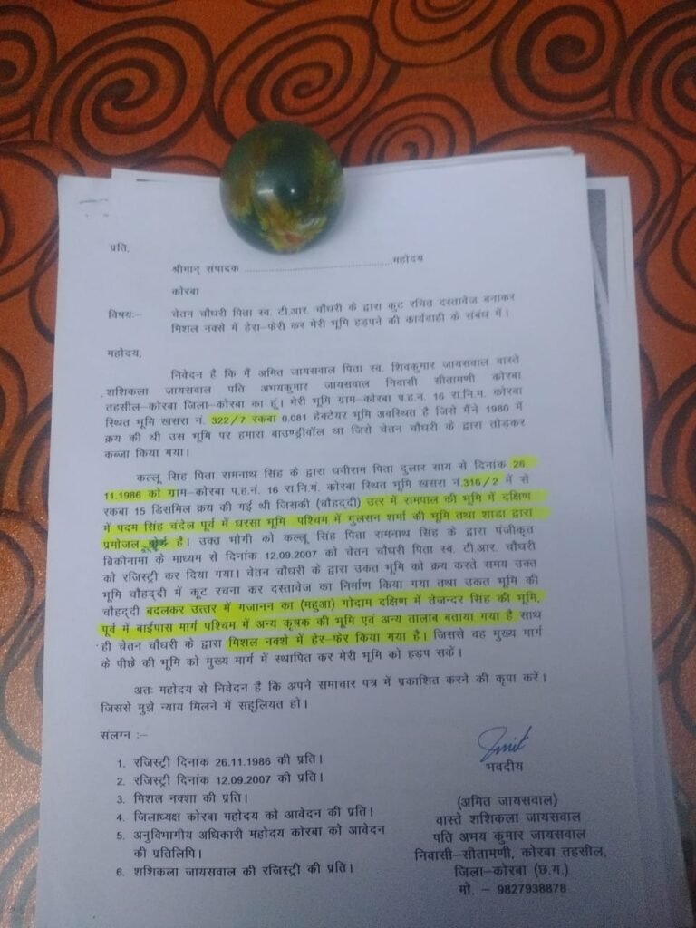शिकायतकर्ता अमित जायसवाल द्वारा जिलाधीश को दिए गए आवेदन में कहा गया है कि ग्राम कोरबा स्थित खसरा नंबर 322/7 की 0.081 हेक्टेयर ज़मीन पर चेतन चौधरी ने अवैध कब्जा कर लिया है। चेतन ने 2007 में एक भूमि की रजिस्ट्री कराई, लेकिन चौहद्दी में चालाकी से फर्जी नाम डाल दिए – ताकि बगल की जमीन को अपनी बताकर कब्जे की जाल बिछा सके।