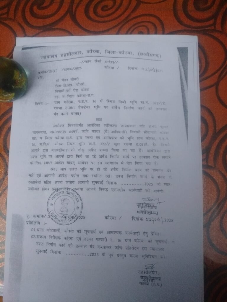 शशिकला जायसवाल की शिकायत पर तहसीलदार कोरबा ने चेतन चौधरी को भूमि पर किसी भी प्रकार का निर्माण रोकने का स्पष्ट आदेश दिया है और कोर्ट में दस्तावेज़ों के साथ पेश होने को कहा है। लेकिन आदेश के बाद भी चेतन ने खुलेआम निर्माण जारी रखा है — जो कोर्ट की सीधी अवमानना है।