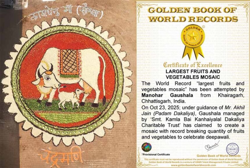 रायपुर । मनोहर गौशाला खैरागढ़ ने एक बार फिर इतिहास रच दिया है। इस दीपोत्सव पर यहां 2700 किलो फलों, सब्जियों और सूखे मेवों से बनी “कामधेनु रंगोली” तैयार की गई, जिसने गोल्डन बुक ऑफ वर्ल्ड रिकॉर्ड्स में स्थान प्राप्त किया।