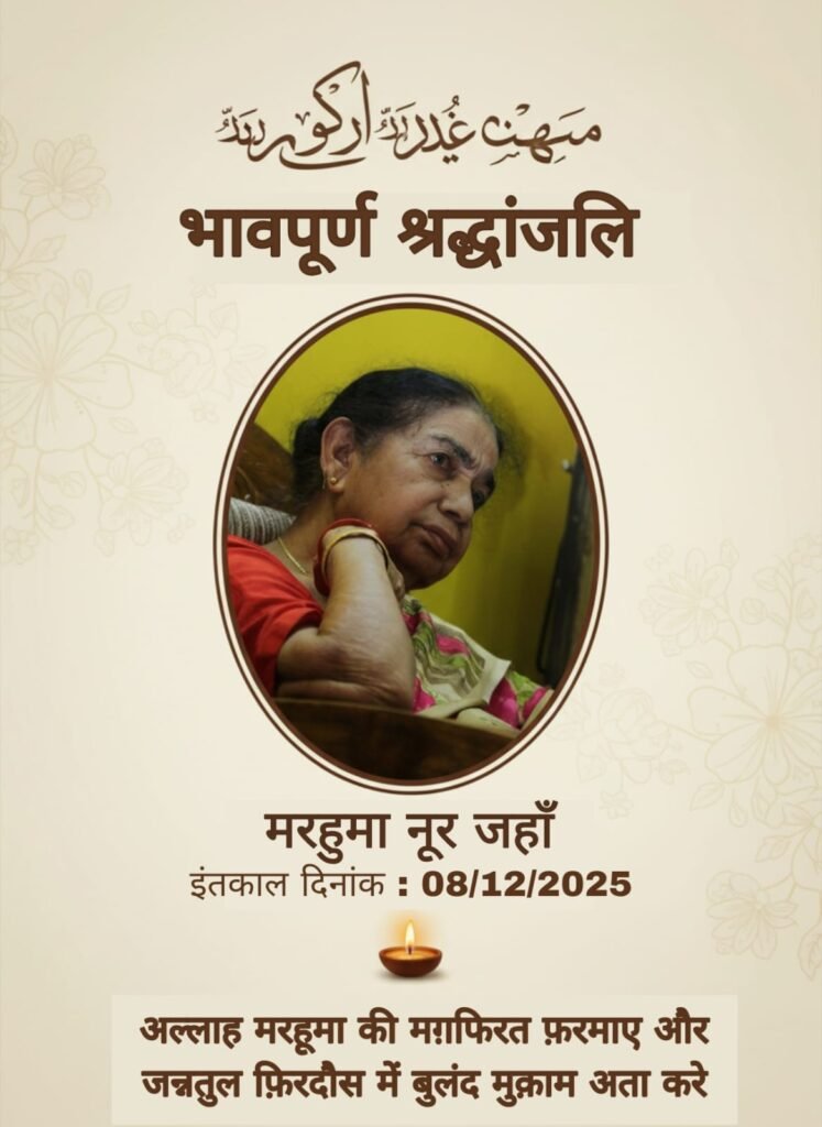 शहर आज एक ऐसी बुज़ुर्ग हस्ती से महरूम हो गया, जिनके व्यक्तित्व में सादगी, इंसानियत, तहज़ीब और दुआओं की खुशबू बसी हुई थी। अधिवक्ता एवं पार्षद अब्दुल रहमान की अम्मी और ग्राम यात्रा न्यूज़ नेटवर्क के संपादक अब्दुल सुल्तान की माता मरहूमा नूर जहाँ का शुक्रवार तड़के करीब 4 बजे रज़ा-ए-इलाही से इंतकाल हो गया। उनके निधन की खबर ने पूरे क्षेत्र में एक गहरा सन्नाटा छोड़ दिया।