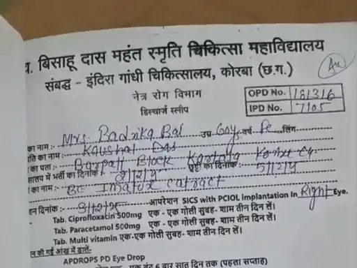 डॉक्टरों ने जांच के बाद बद्रिका बाई की दाहिनी आंख में मोतियाबिंद बताया और ऑपरेशन की सलाह दी। तीन दिसंबर को उनकी दाहिनी आंख का ऑपरेशन किया गया। मोतियाबिंद के ऑपरेशन के बाद महिला की आंख की रोशनी गई,ऑपरेशन के अगले दिन जब आंख की पट्टी खोली गई, तो महिला को कुछ भी दिखाई नहीं दिया।