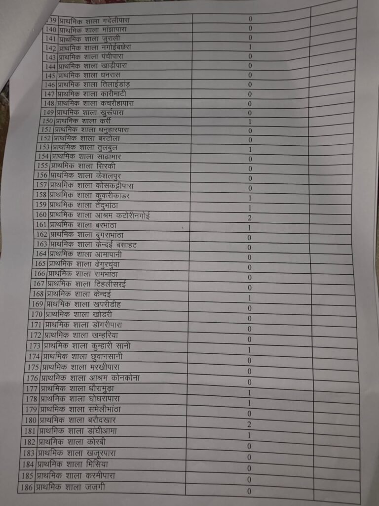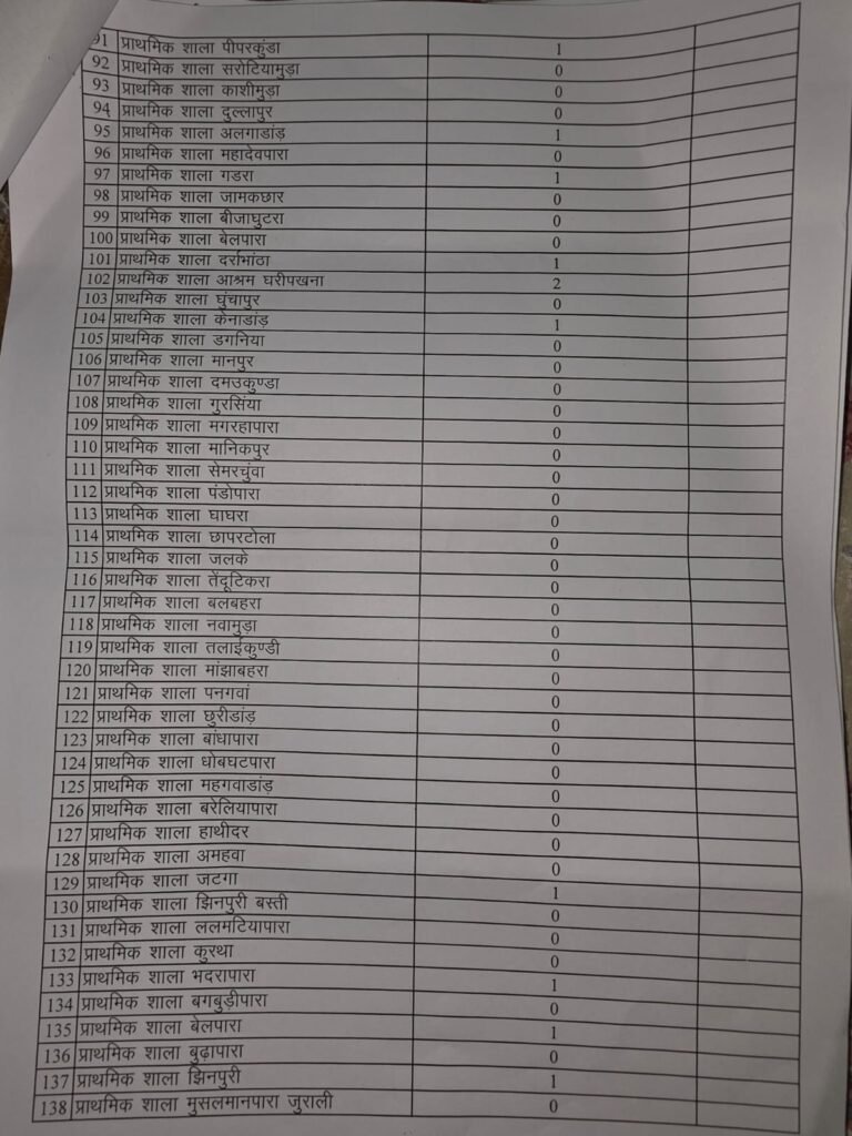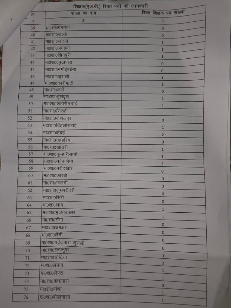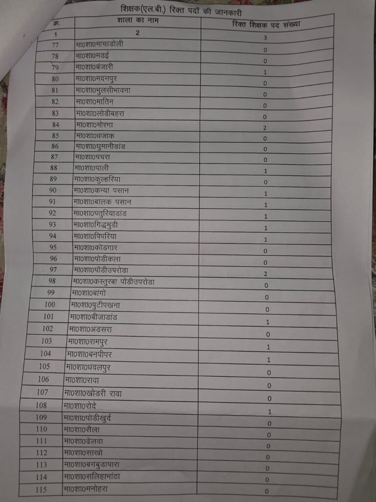 कसनिया,तनेरा एवं तुमान शामिल हैं। शासन स्तर से इन रिक्त पदों की पूर्ति के लिए शीघ्र कवायद की दरकार है। ताकि आकांक्षी ब्लॉक की शिक्षा अध्यापन व्यवस्था सुदृढ़ हो सके।