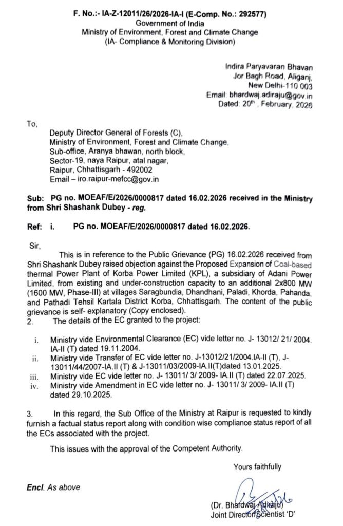देश के प्रमुख निजी बिजली उत्पादक समूह Adani Power Limited की सहायक कंपनी Korba Power Limited (KPL) की 1600 मेगावाट विस्तार परियोजना अब गंभीर पर्यावरणीय, कानूनी और प्रशासनिक विवादों में घिर गई है। पर्यावरण, वन एवं जलवायु परिवर्तन मंत्रालय (MoEFCC), भारत सरकार ने Draft Environmental Impact Assessment (EIA) में कथित भ्रामक जानकारी और पर्यावरणीय स्वीकृति (Environmental Clearance – EC) की शर्तों के अनुपालन को लेकर आधिकारिक जांच शुरू कर दी है।