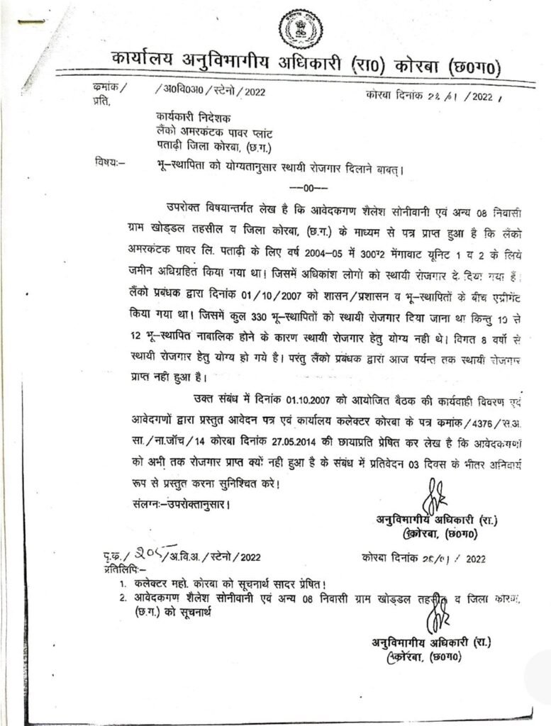 एसडीएम ने 28 जनवरी 2022 व कलेक्टर कोरबा द्वारा 11 नवंबर 2022 को जारी आदेश में भी विस्थापित परिवारों को रोजगार देने के निर्देश दिए गए थे, जिनका पालन नहीं होने का आरोप लगाया गया है।