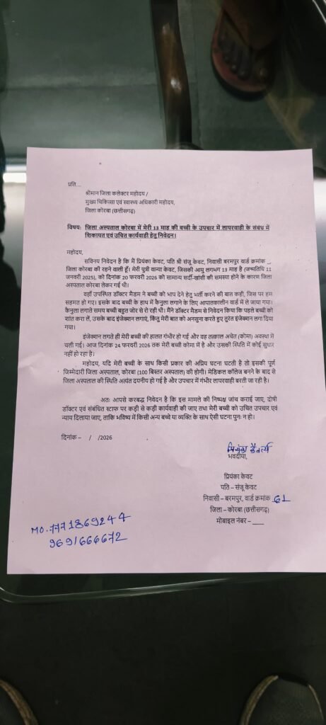 कोरबा। 13 माह की मासूम वानिया केवट की मौत के बाद कोरबा मेडिकल कॉलेज अस्पताल के बाहर जनाक्रोश खुलकर सामने आ गया है। अस्पताल के मुख्य गेट पर बड़ी संख्या में परिजन और स्थानीय लोग धरने पर बैठ गए हैं और मेडिकल कॉलेज प्रबंधन के खिलाफ जमकर विरोध कर रहे हैं। अपनी इकलौती बच्ची को खो चुके माता-पिता और उनके परिजन अस्पताल गेट पर ही डटे हुए हैं और न्याय की मांग कर रहे हैं।