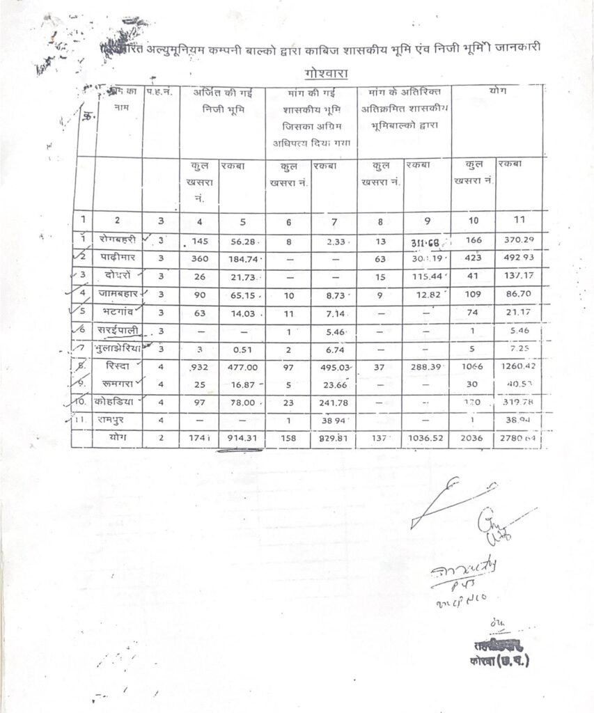 दस्तावेजों के अनुसार बालको के पास कुल 2718 एकड़ भूमि है, जिसमें 914 एकड़ फ्रीहोल्ड और 1804 एकड़ लीज होल्ड है। लेकिन असली विवाद लीज होल्ड भूमि को लेकर खड़ा हो रहा है, क्योंकि पूरी जमीन स्पष्ट और निर्विवाद नहीं दिखाई देती।