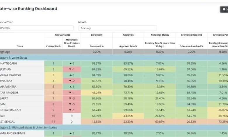 जारी रैंकिंग के अनुसार छत्तीसगढ़ ने 93.37 प्रतिशत नामांकन, 83.87 प्रतिशत स्वीकृति दर और 93.95 प्रतिशत शिकायतों के त्वरित समाधान के साथ उत्कृष्ट प्रदर्शन किया है। वहीं 30 दिनों से अधिक लंबित प्रकरणों की दर मात्र 7.07 प्रतिशत और लंबित शिकायत दर 4.96 प्रतिशत दर्ज की गई है, जो योजना के प्रभावी और पारदर्शी क्रियान्वयन को दर्शाती है। उल्लेखनीय है कि छत्तीसगढ़ ने पिछले माह की तुलना में 6 स्थानों की छलांग लगाकर पहला स्थान प्राप्त किया है।