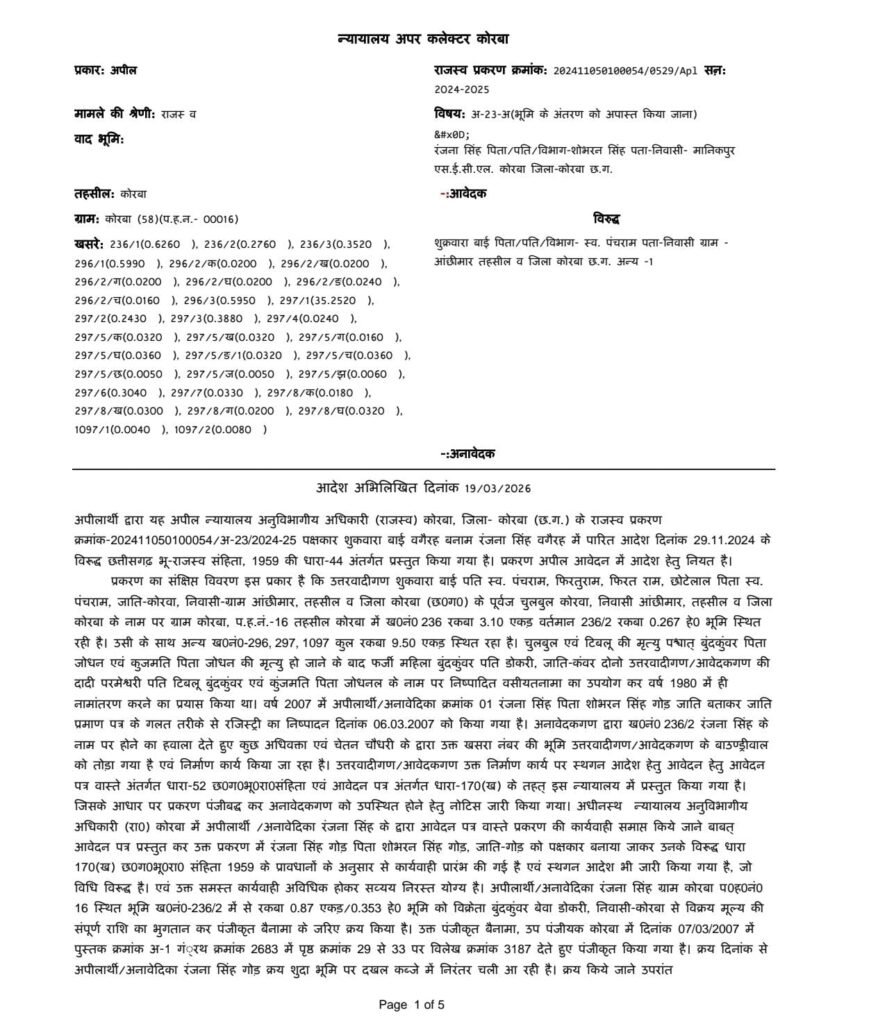 कोरबा। कोरबा जिले में पहाड़ी कोरवा आदिवासी की पुश्तैनी जमीन पर कब्जे का मामला अब एक बड़े खुलासे के रूप में सामने आया है, जिसने न केवल राजस्व व्यवस्था बल्कि पूरे प्रशासनिक तंत्र पर सवाल खड़े कर दिए हैं। ताजा घटनाक्रम में अपर कलेक्टर न्यायालय से दिनांक 24 मार्च 2026 को पारित आदेश ने इस पूरे प्रकरण में हुए फर्जीवाड़े को फिर से उजागर कर दिया है। प्रकरण क्रमांक 202411050100054/2024-25 में दिए गए इस आदेश में स्पष्ट रूप से उल्लेख किया गया है कि वर्ष 2007 में की गई जमीन की रजिस्ट्री संदिग्ध परिस्थितियों में हुई थी और इसमें कई गंभीर कानूनी खामियां पाई गई हैं।