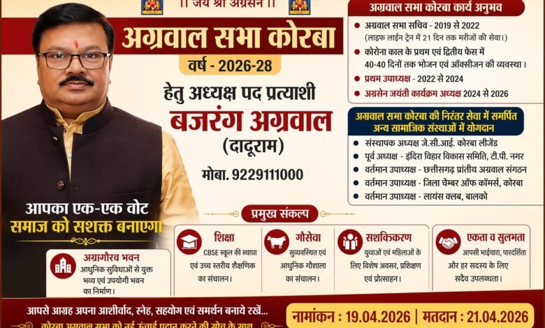अग्रवाल समाज को नई दिशा और मजबूती देने के उद्देश्य से अग्रवाल सभा कोरबा के आगामी सत्र 2026-28 के लिए अध्यक्ष पद पर बजरंग अग्रवाल (दादूराम) ने अपनी दावेदारी प्रस्तुत की है । उन्होंने समाज के सर्वांगीण विकास और एकजुटता को प्राथमिकता देते हुए कई महत्वपूर्ण संकल्पों की घोषणा की है ।