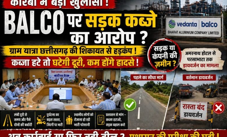 BALCO पर सड़क कब्जे का आरोप ? ‘ग्राम यात्रा छत्तीसगढ़’ की शिकायत से मचा हड़कंप ! कब्जा हटे तो घटेगी दूरी, कम होंगे हादसे — प्रशासन के सामने बड़ी चुनौती