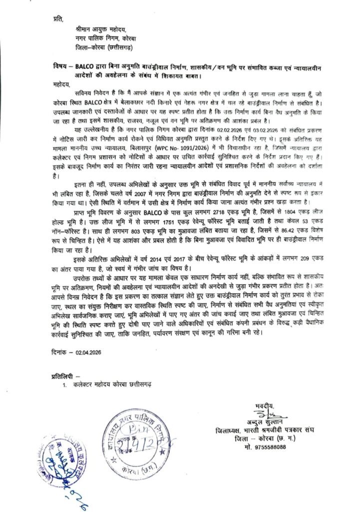 जानकारी के अनुसार जिला कलेक्टर कुणाल दुदावत के स्पष्ट निर्देश के बाद नगर पालिक निगम आयुक्त आशुतोष पाण्डेय ने मामले को गंभीरता से लेते हुए तुरंत कार्रवाई शुरू की है और बालको को 3 दिन के भीतर अवैध बाउंड्रीवाल हटाने का अल्टीमेटम जारी किया गया है।