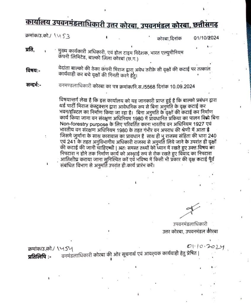 इस पूरे मामले को और गंभीर बनाता है कार्यालय उपवनमंडलाधिकारी, उत्तर कोरबा का पत्र क्रमांक/उ.को./1453 दिनांक 01.10.2024 । इस पत्र में स्पष्ट रूप से उल्लेख किया गया था कि BALCO प्रबंधन की ठेका कंपनी द्वारा बिना अनुमति के निर्माणाधीन हॉस्टल में वृक्षों की कटाई कर निर्माण कार्य किया जा रहा है, जो कि भारतीय वन अधिनियम 1927 और वन संरक्षण अधिनियम 1980 के तहत गंभीर अपराध की श्रेणी में आता है ।