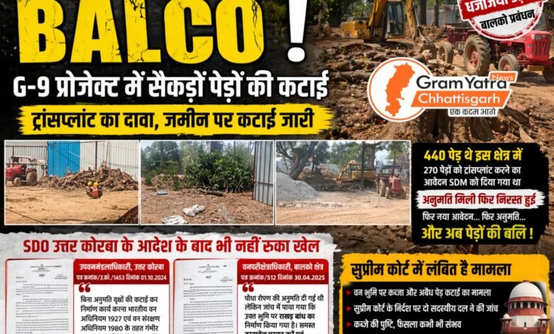 हरियाली का दुश्मन और बेजाकब्जा के लिए पहले से ही चर्चित BALCO का एक और बड़ा खेल सामने आया है ! इस बार मामला उसके निर्माणाधीन आवासीय परिसर G-9 से जुड़ा हुआ है, जहां सैकड़ों हरे-भरे पेड़ों की कटाई और नियमों की खुलेआम अनदेखी के गंभीर आरोप सामने आ रहे हैं ।